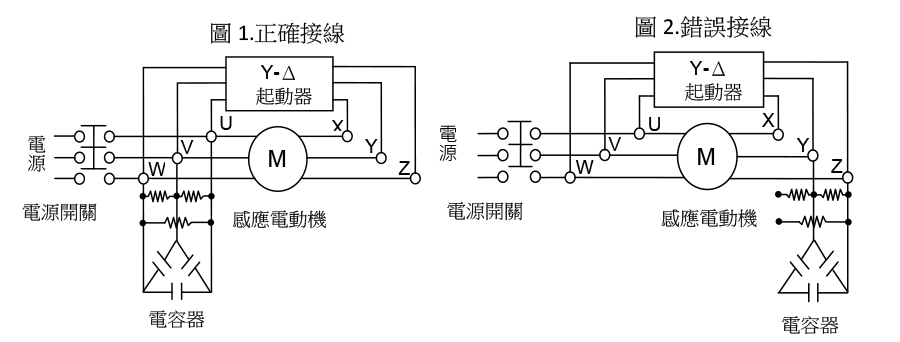induction motor with Y-Δ (star-delta) starting, incorrect wiring can lead to capacitor damage.